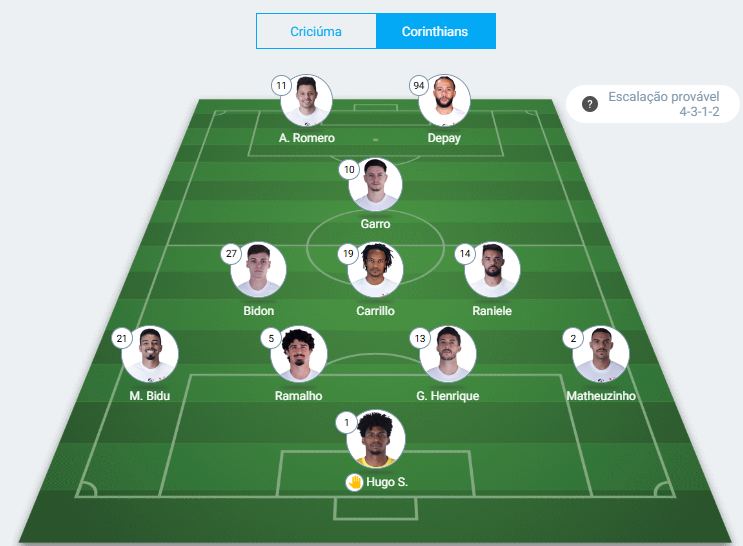 - Provável escalação da Corinthians:Hugo Souza; Matheuzinho, Gustavo Henrique, André Ramalho, M. Bidu; Raniele, Carrillo, Bidon, Garro; Memphis e Romero