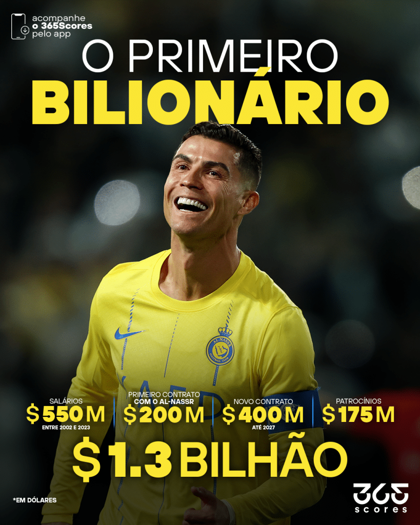O atacante de 40 anos atingiu o feito após sua renovação de contrato com o Al-Nassr. O novo vínculo de Cristiano Ronaldo com o clube saudita vale mais de 400 milhões de dólares (cerca de R$ 2,1 bilhões) e, com isso, o português sobe seu patrimônio para 1,4 bilhão de dólares (cerca de R$ 7,5 bilhões na cotação atual).