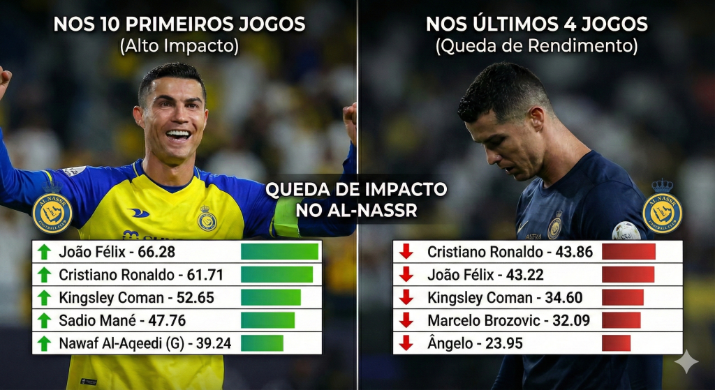 Cristiano Ronaldo puxa o barco como um todo da queda do Al-Nassr. João Félix, por exemplo, tinha NI médio de 66.28 no início da competição. Agora, viu o a média cair de forma brusca para 43.22. Kingsley Coman, que era o terceiro melhor com média de 52.65, caiu para 34.60.