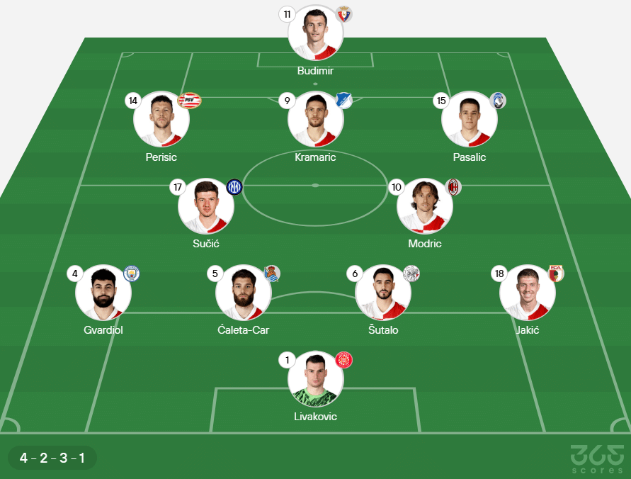 Provável escalação da Croácia: Livakovic; Jakic, Sutalo, Caleta-Car e Gvardiol; Sucic e Modric; Pasalic, Perisic e Kramaric; Budimir.