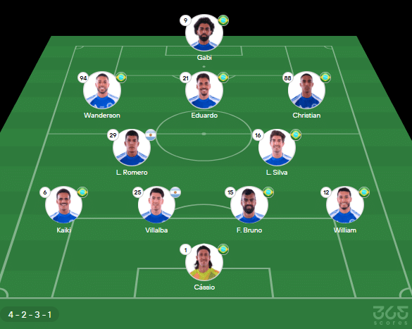 - Provável escalação do Cruzeiro: Cássio; William, Fabrício Bruno, Villalba, Kaiki; Lucas Silva, Lucas Romero, Eduardo; Christian, Wanderson, Gabi (Kaio Jorge)