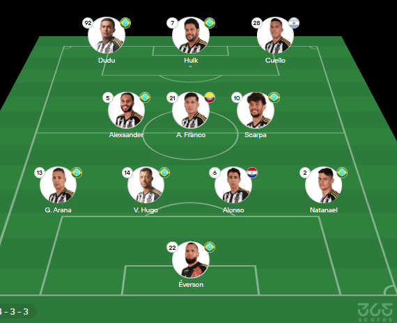 - Provável escalação do Atlético-MG: Everson; Natanael, Alonso, Vitor Hugo (Lyanco), G. Arana; Scarpa, Alan Franco, Alexsander; Cuello, Hulk, Dudu