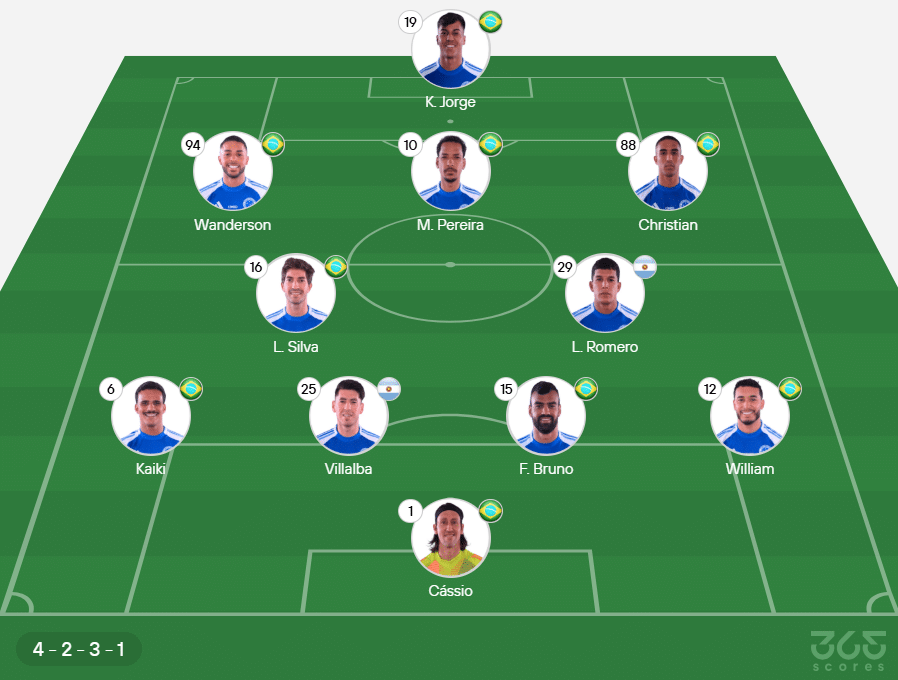 - Provável escalação do Cruzeiro: Cássio; William, Fabrício Bruno, Villalba e Kaiki; Lucas Romero e Lucas Silva; Matheus Pereira, Christian e Wanderson; Kaio Jorge.