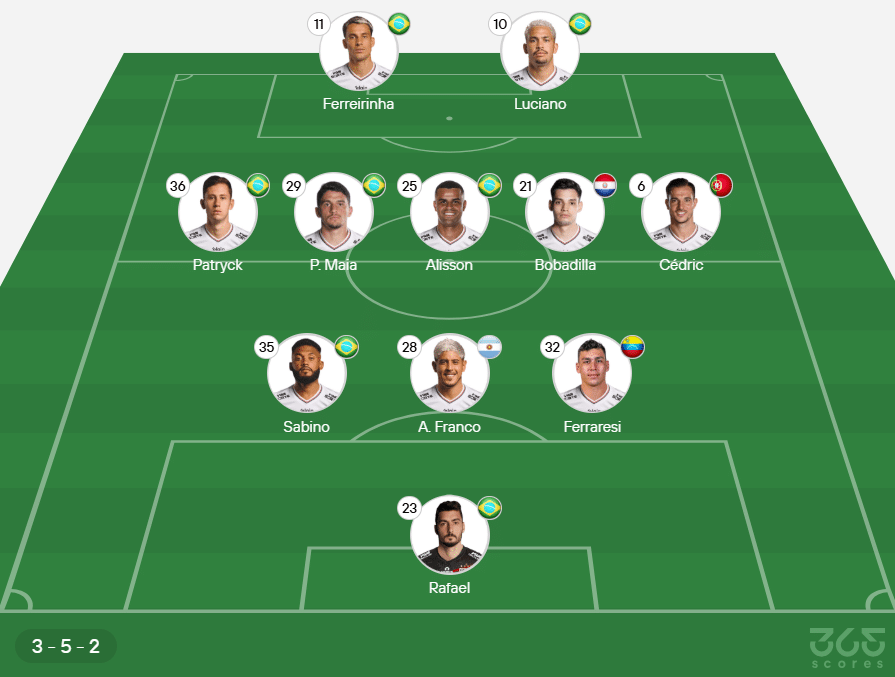 Provável escalação do São Paulo: Rafael; Ferraresi, Alan Franco e Sabino; Cédric, Bobadilla, Alisson, Pablo Maia e Patryck; Ferreirinha e Luciano.