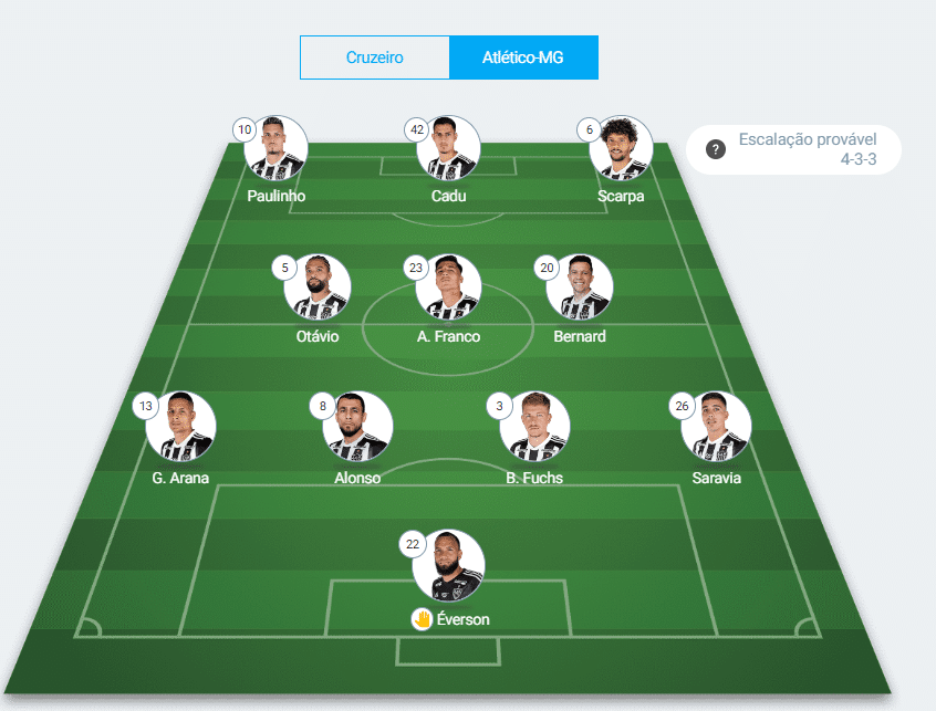 O Atlético não deverá ter tantas mudanças como o rival, mas em comparação com o jogo de maio, tem pelo menos três mudanças: Hulk é desfalque, Jemerson se transferiu para o Grêmio e Cadu deverá estar no time titular.