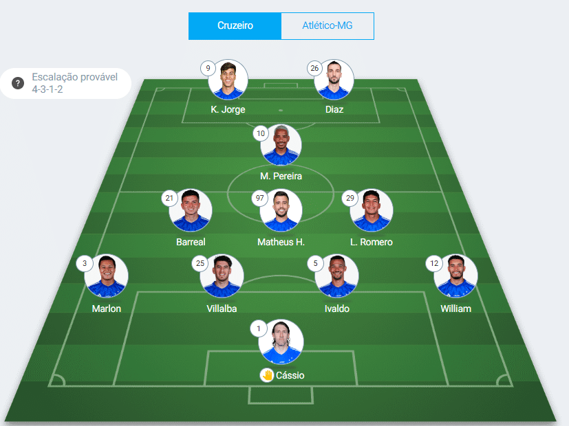 Em comparação com a equipe que entrou em campo no último clássico, a provável escalação do Cruzeiro para hoje terá seis alterações. O goleiro Anderson Paixão perdeu espaço para Cássio, João Marcelo está suspenso, Néris e Machado deixaram o clube rumo ao vitória, Lucas Silva, Arthur Gomes e Rafa Silva estarão no banco de reservas.