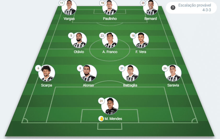 Provável escalação do Galo: Éverson; Saravia, Battaglia, Alonso; Scarpa, Vera, Franco, Otávio, Bernard; Paulinho e Vargas.
