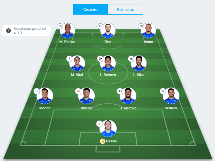 - Provável escalação do Cruzeiro: Cássio; William, João Marcelo, Villalba, Marlon; Lucas Silva, Lucas Romero, Matheus Vital; Veron, Lautaro Díaz e Matheus Pereira