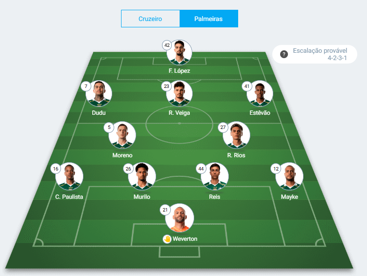 - Provável escalação do Palmeiras: Weverton; Mayke, Reis, Murilo, Caio Palista, R. Rios, Moreno, Veiga; Estêvão, Dudu e Flaco López.