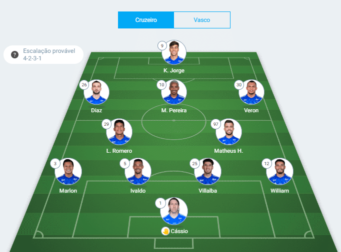 - Provável escalação do Cruzeiro: Cássio; William, Villalba, Zé Ivaldo, Marlon; Matheus Henrique, Lucas Romero, Matheus Pereira; Veron, Díaz e Kaio Jorge.
