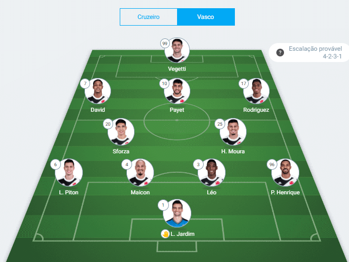 - Provável escalação do Vasco: Léo Jardim; P. Henrique, Léo, Malcon, Lucas Piton; Hugo Moura, Sforza, Payet; Rodríguez, David e Vegetti.