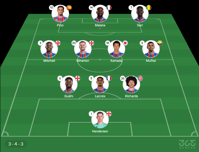 Provável escalação do Crystal Palace: Henderson, Richards, Lacroix, Guéhi; Muñoz, Kamada, Wharton, Mitchell; Sarr, Pino, Mateta. Técnico: Oliver Glasner