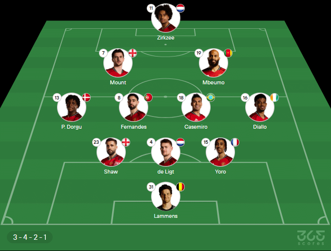 Provável escalação do Manchester United: Lammens, Yoro, De Ligt, Shaw; Diallo, Casemiro, Fernandes, Dorgu, Mbeumo, Mount; Zirkzee. Técnico: Ruben Amorim