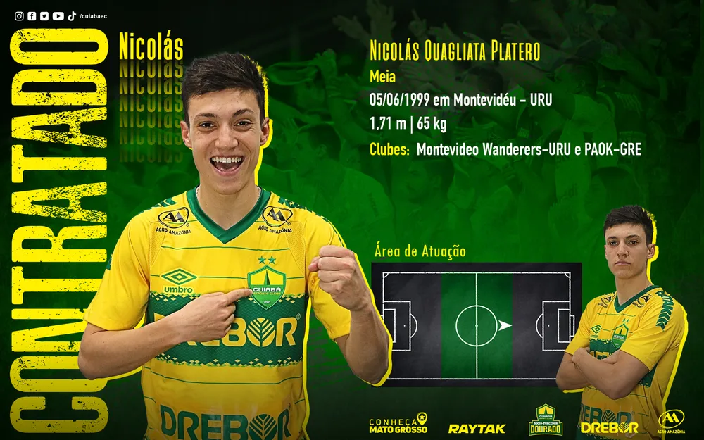 O Cuiabá anunciou nesta sexta-feira seu décimo reforço para 2023. Trata-se do meia uruguaio Nicolás Guagliata, que chega por empréstimo do PAOK, da Grécia, até o fim da temporada.