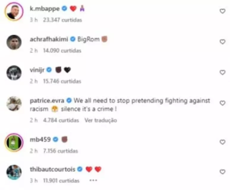 Atletas como Vini Jr., Mbappé, Courtois e Hakimi publicaram mensagens em apoio ao belga. Por sua vez, o ex-jogador Seedorf escreveu para Lukaku uma mensagem convocando uma ação pacífica contra o racismo.