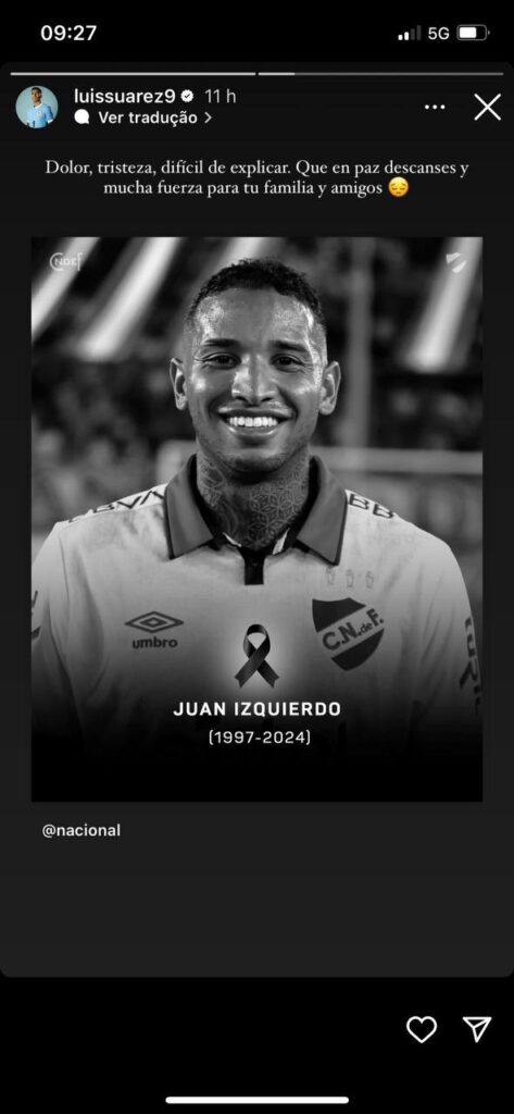 Apesar de Suárez nunca ter atuado junto de Juan Izquierdo, o camisa 9 do Inter Miami também escreveu uma mensagem desejando forças para os familiares de seu compatriota, que defendia as cores do Nacional, onde o “Pistolero” foi revelado.