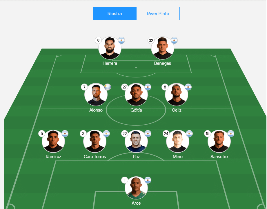 - Provável escalação do Deportivo Riestra: Arce; Sansotre, Mino, Paz, Caro Torres e Ramírez; Celiz, Goitia e Alonso; Benegas e Herrera.