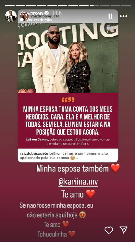Deyverson não perdeu tempo e aproveitou a fala do jogador de basquete para se declarar para a esposa Karina. No Instagram, o centroavante escreveu: