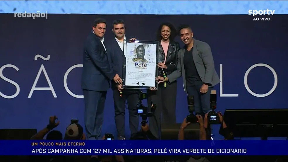 Durante evento realizado no Pacaembu, nesta quarta-feira (26), Pelé foi homenageado mais uma vez. Sua família, que estava presente, foi presenteada com uma placa com o verbete.