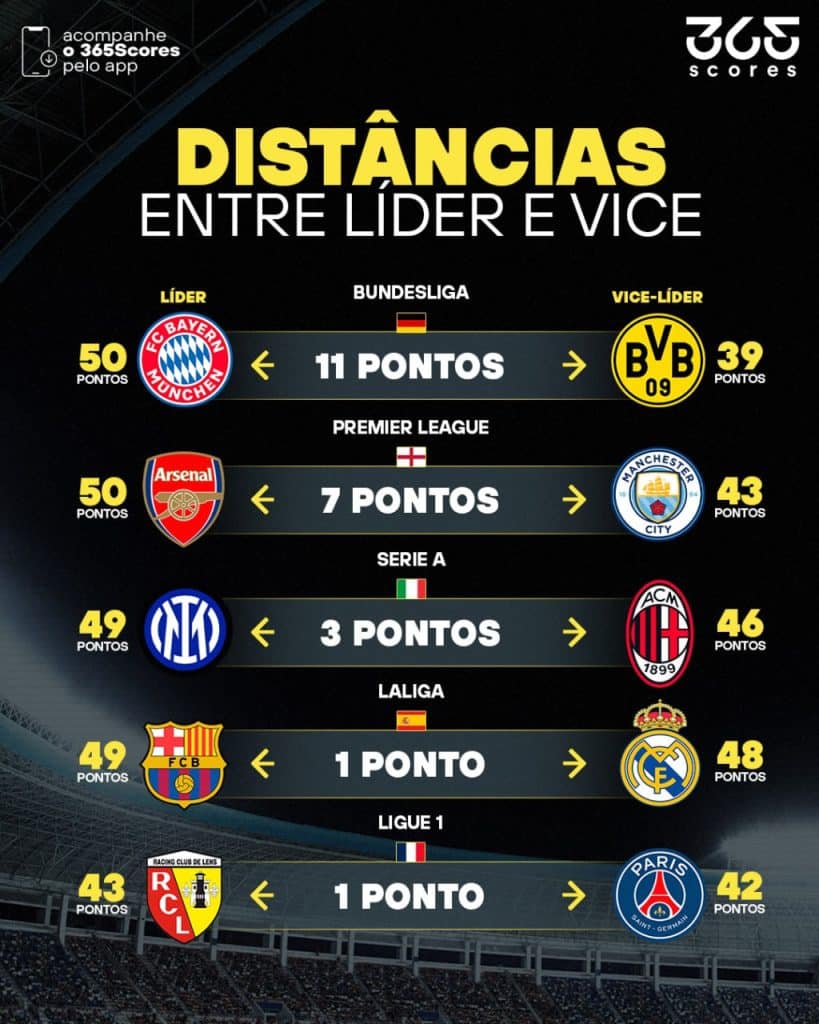 A equipe do 365Scores preparou um levantamento exclusivo detalhando a distância exata de pontuação entre os primeiros e segundos colocados das cinco principais ligas da Europa (Premier League, La Liga, Bundesliga, Serie A e Ligue 1).