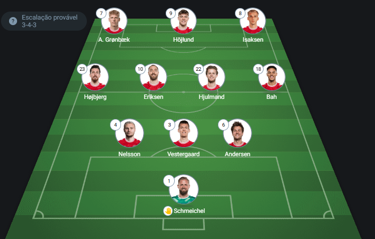 - Provável escalação da Dinamarca: Schmeichel, Nelsson, Vestergaard e Andersen; Hojbjerg, Eriksen, Hjulamand e Bah; Gronbaek, Isaksen e Hojlund