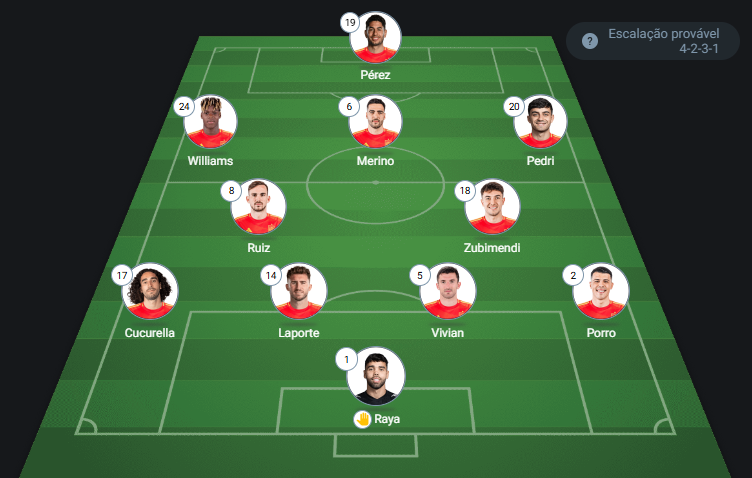 Provável escalação da Espanha: Raya, Cucurella, Laporte, Vivian e Pedro Porro; Fabián Ruiz, Zubimendi, Nico Williams, Mikel Merino e Pedri; Ayoze Pérez . Técnico: Luis De La Fuente.