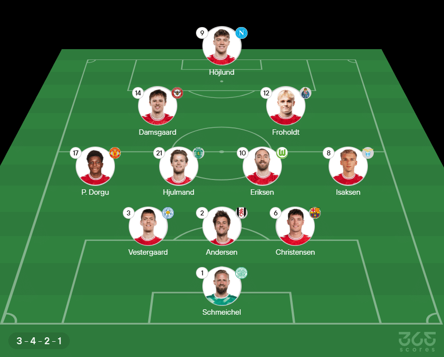 Provável escalação da Dinamarca: Schmeichel, Vestergaard, Andersen e Christensen; Patrick Dorgu, Hjulmand, Eriksen e Isaksen; Damsgaard, Froholdt e Rasmus Höjlund. Técnico: Brian Riemer.