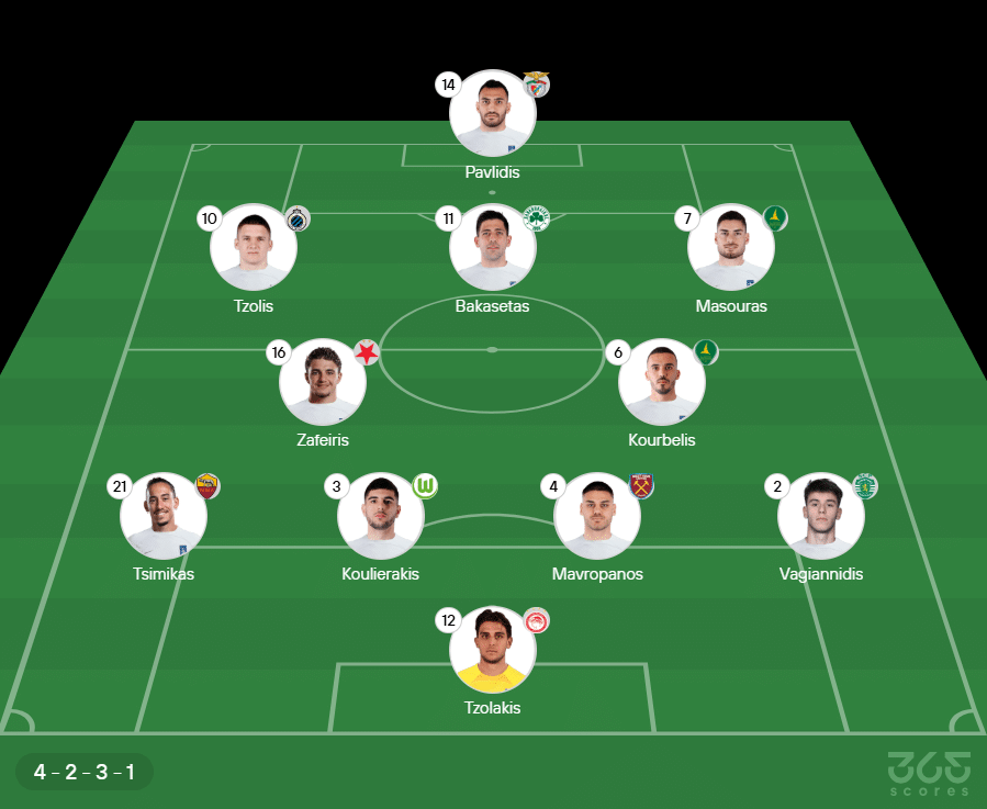- Provável escalação da Grécia: Tzolakis, Tsimikas, Koulierakis, Mavropanos e Vagiannidis; Zafeiris, Kouberlis, Tzolis, Bakasetas e Masouras; Pavlidis