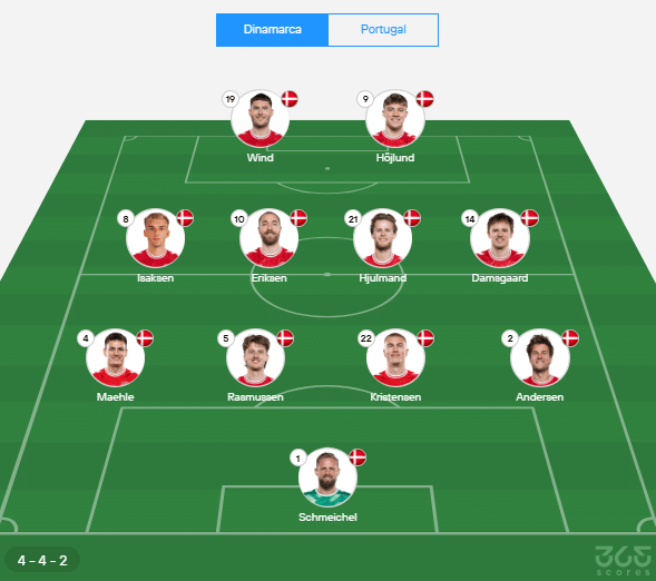 - Provável escalação do Dinamarca: Schmeichel; Andersen, Kristensen, Rasmussen, Maehle; Damgaard, Hjulmand, Eriksen, Isaksen; Hojlund e Wind