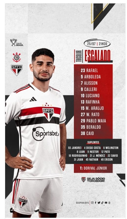 Na noite desta terça-feira (25), o São Paulo enfrentará o Corinthians, às 21h30 (de Brasília), na Neo Quimica Arena, pela partida de ida das semifinais da Copa do Brasil. Para a partida, o treinador Dorival Júnior terá força máxima.