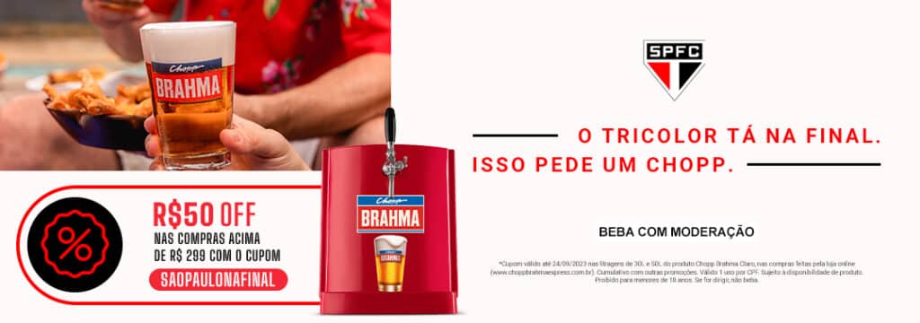 Patrocinadora oficial da Copa do Brasil, a Brahma irá proporcionar uma promoção imperdível para os torcedores que gostam de assistir aos jogos com a companhia de um chopp gelada. Com o cupom SÃOPAULONAFINAL, em pedidos acima de R$ 299, o consumidor ganha R$ 50 de desconto