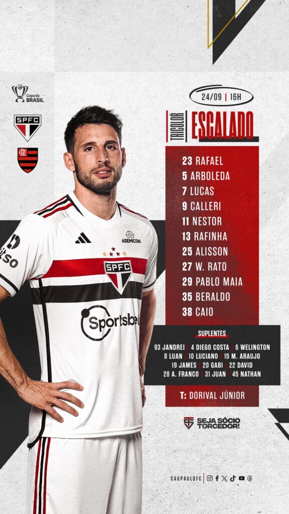 Dorival Júnior escalou o São Paulo sem novidades para a partida de volta da final da Copa do Brasil contra o Flamengo. Depois de vencer a partida de ida em casa por 1 a 0 no Morumbi, o Tricolor Paulista vai a campo com a mesma escalação do jogo anterior.