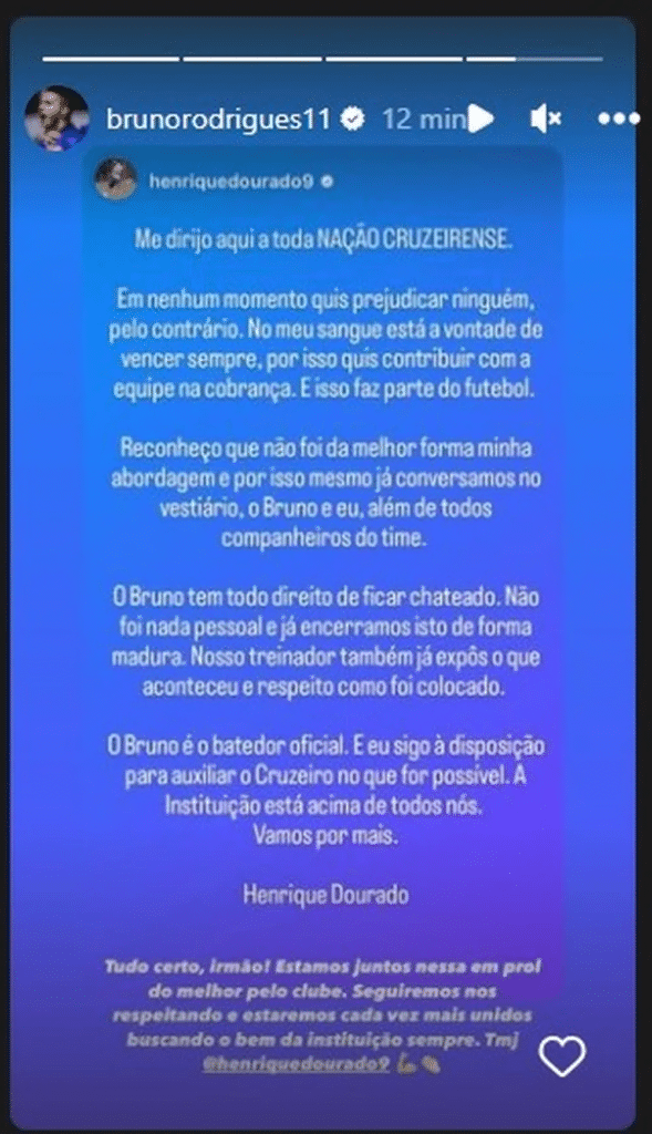 Em seguida, o companheiro de equipe, Bruno Rodrigues repostou a mensagem do companheiro de equipe e ressaltou que resolveram tudo após o fim do jogo.