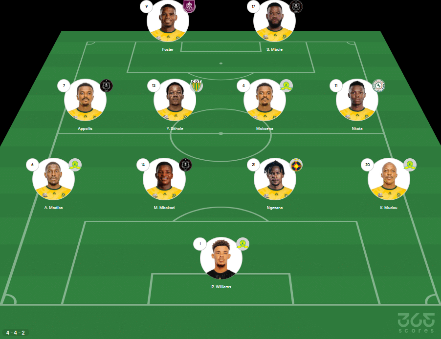 - Provável escalação da África do Sul: Williams; Mudau, Ngezana, Mbokazi e Modiba; Nkota, Mokoena, Sitholee e Apollis; Mbule e Foster