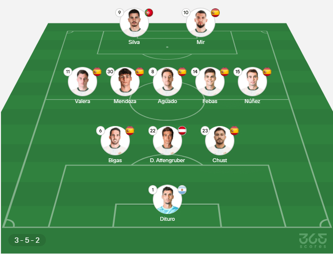 - Escalação do Elche: Dituro, Chust, Affengruber, Bigas; Nuñez, Febas, Aguado, Mendoza, Valera; Rafa Mir, André Silva