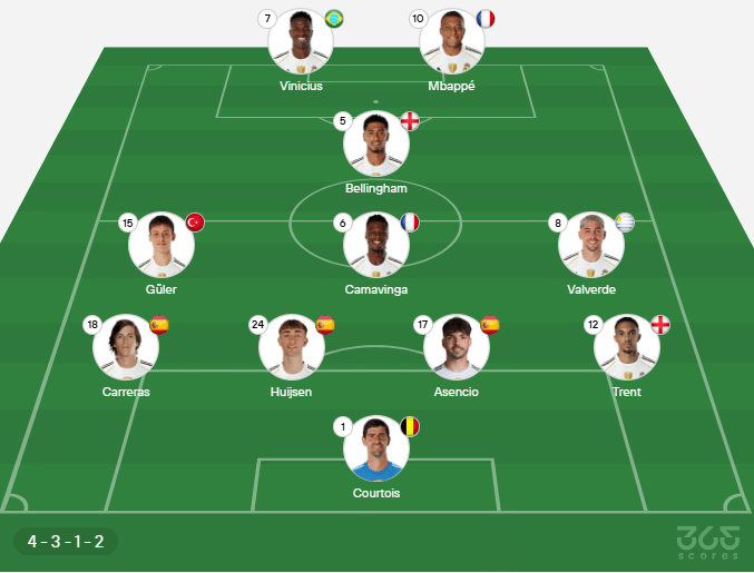 Provável escalação do Real Madrid: Courtois, Alexander-Arnold, Asencio, Huijsen, Carreras; Valverde, Camavinga, Güler, Bellingham; Mbappé, Vinicius Júnior. Técnico: Xabi Alonso