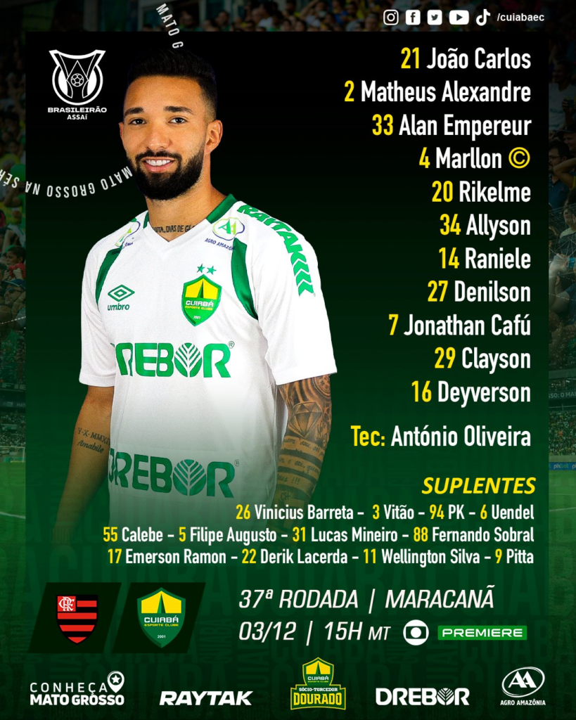 O Flamengo está definido para encarar o Cuiabá, neste domingo, às 16h (de Brasília), no Maracanã, em uma partida que promete ser emocionante. Além de valer os três pontos e garantir a permanência no G-4 do Brasileirão, o confronto marcará a última partida de Filipe Luís como profissional e a despedida de Rodrigo Caio. O técnico Tite começará com o lateral como titular.