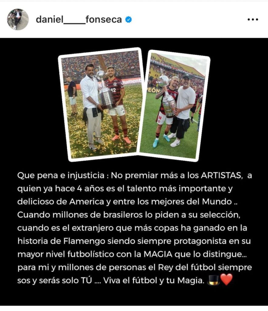 Em meio a uma publicação do Instagram, Daniel Fonseca indicou que o prêmio foi injusto. “Que pena e injustiça: não premiar os ARTISTAS, a quem há quatro anos é o talento mais importante e delicioso da América e do mundo”, iniciou.