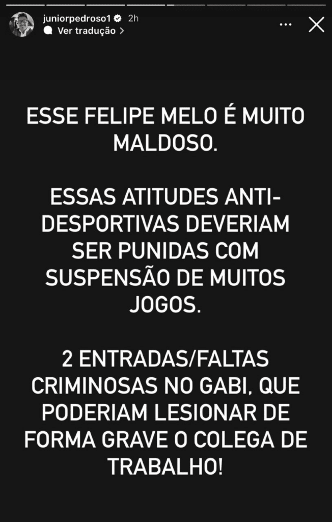 “Esse Felipe Melo é muito maldoso. Essas atitudes antidesportivas deveriam ser punidas com suspensão de muitos jogos. Duas entradas/faltas criminosas no Gabi, que poderiam lesionar de forma grave o colega de trabalho”, escreveu Junior Pedroso, no Instagram.
