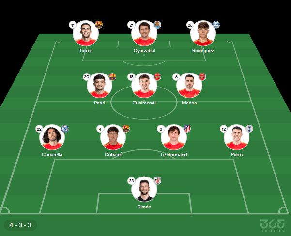 Provável escalação da Espanha: Simón; Porro, Le Normand, Cubarsi, Cucurella; Menino, Zubimendi, Pedri; Rodríguez, Torres, Oyarzabal. Técnico: Luis de La Fuente