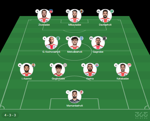 - Provável escalação do Geórgia: Mamardashvilli; Kakabadze; Kashia, Goglichidze, Azarovi; Gagnidze, Mekvabishvili, Kochorashvili; Davitashvili, Zivzvadze, Mikautadze