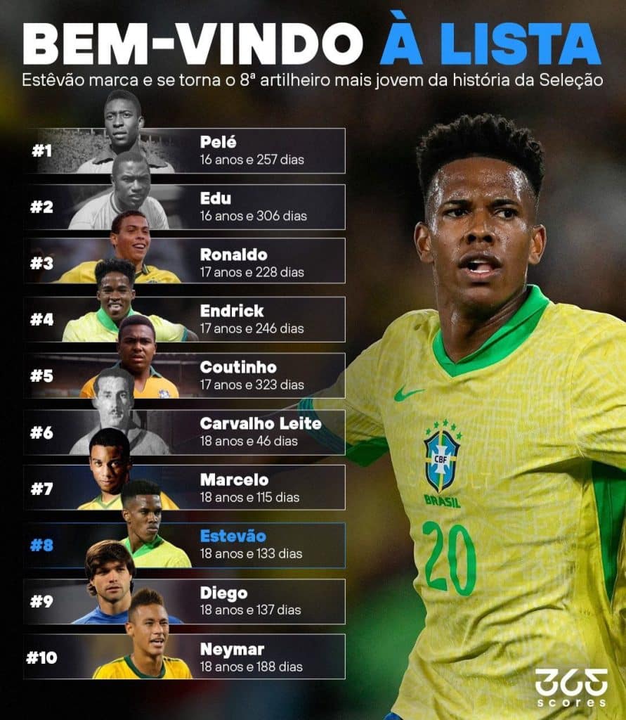 Estêvão se torna o oitavo jogador mais jovem a marcar pelo Brasil; veja a lista