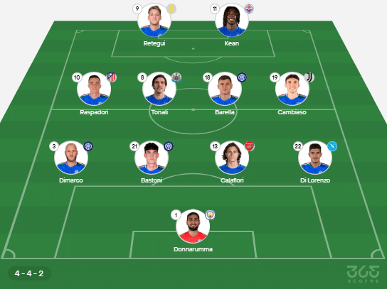 - Provável escalação de Itália: Donnarumma, Di Lorenzo, Calafiori, Bastoni, Dimarco; Cambiasso, Barella, Tonali, Raspadori; Kean, Retegui