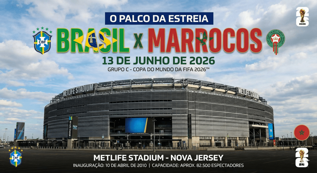 A espera acabou e o caminho para o Hexa já tem data e hora para começar. No dia 13 de junho de 2026, às 19h (de Brasília), a Seleção Brasileira fará sua estreia na Copa do Mundo enfrentando o perigoso time do Marrocos — semifinalista histórico no Catar em 2022. O palco escolhido pela Fifa para este duelo de gigantes foi o imponente MetLife Stadium, em East Rutherford, Nova Jersey.