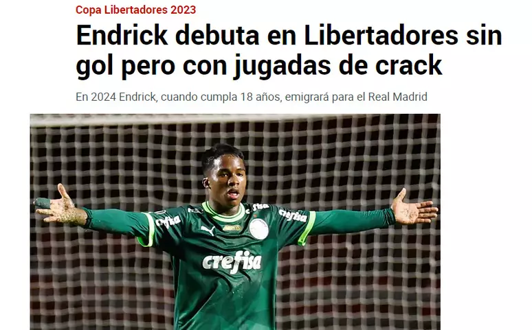 Além de ser a primeira vitória do Palmeiras nesta Libertadores, o duelo da última quinta-feira (20) contra o Cerro Porteño, marcou a estreia de Endrick na competição. Aos 16 anos, o atacante, vendido ao Real Madrid por cerca de 70 milhões de euros, entrou em campo no segundo tempo e chamou a atenção da mídia internacional.