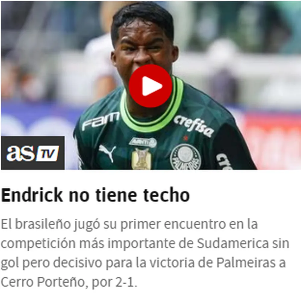 “Sem medo, relaxado, solto e participativo”, escreveu o Marca ao elogiar a postura de Endrick contra o Cerro Porteño. O jornal também ressaltou que o técnico Abel Ferreira não escalou o atacante como titular, já que o jogo “obrigava uma imposição física”.