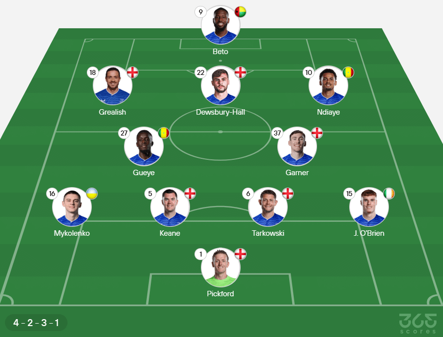 Provável escalação do Everton: Pickford; J. O’Brien, Tarkowski, Keane e Mykolenko; Gueye e Garner; Dewsbury-Hall, Ndiaye e Jack Grealish; Beto.