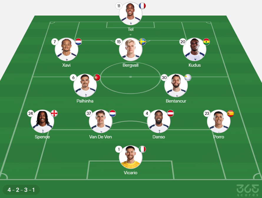 Provável escalação do Tottenham: Vicario; Pedro Porro, Kevin Danso, Van De Ven e Djed Spence; João Palhinha e Bentancur; Bergvall, Xavi Simons e Mohammed Kudus; Mathys Tel.