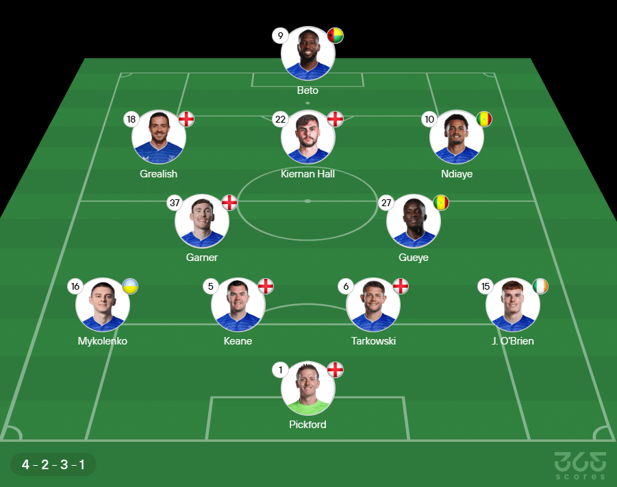 - Provável escalação do Everton: Pickford, Mykolenko, Keane, Tarkowski e O’Brien; Garner, Gueye, Grealish, Kiernan Hall e Ndiaye; Beto