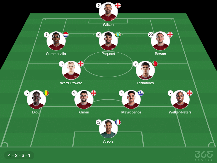 - Provável escalação do West Ham: Areola, Diouf, Kilman, Mavropanos e Walker-Peters; Ward-Prowse, Mateus Fernandes, Summerville, Lucas Paquetá e Bowen; Callum Wilson